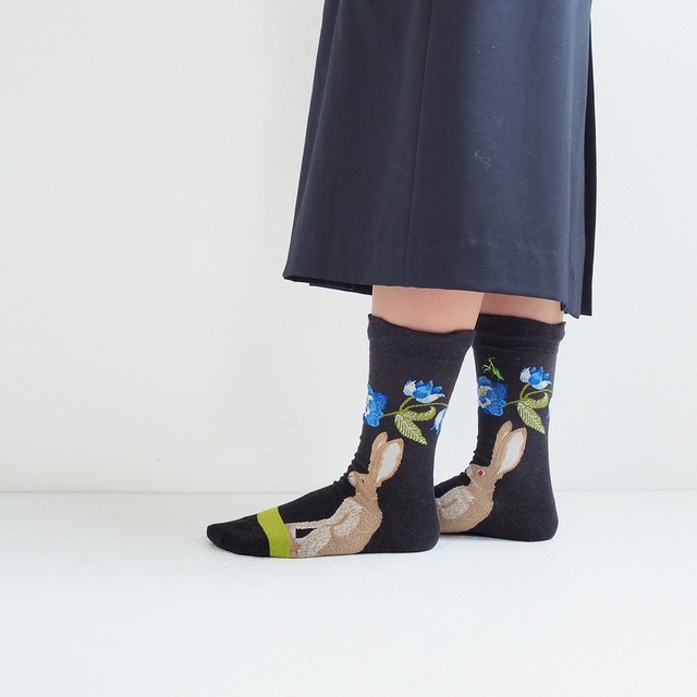 ande アンデ ハイゲージ ソックス 刺繍 靴下 日本製 クルー丈 ラビット/チャコール041