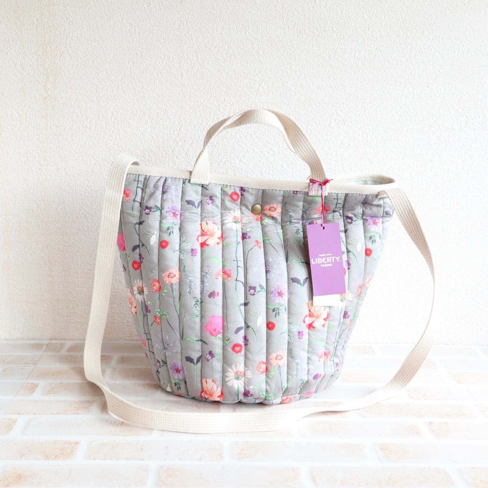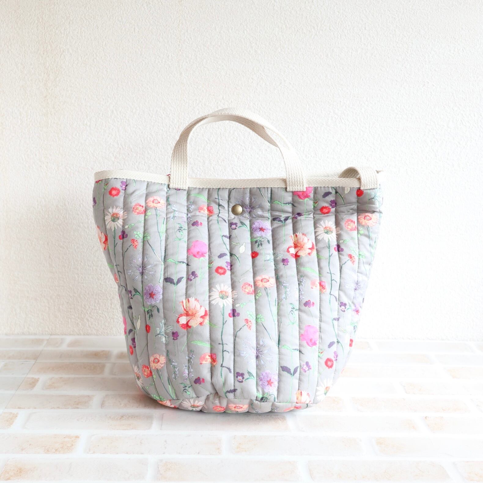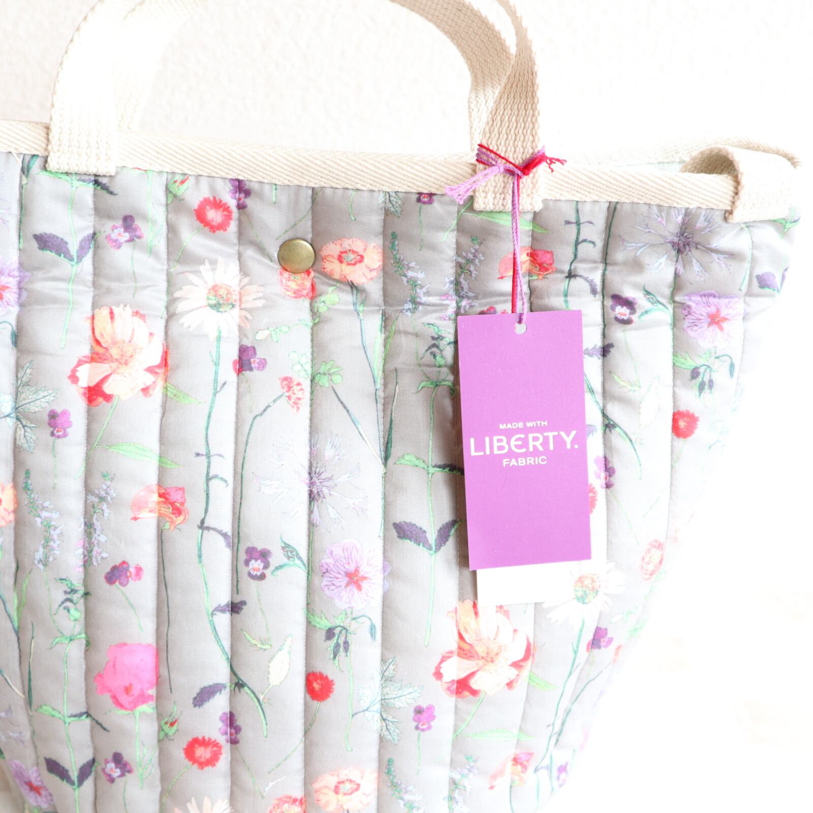 キルティング加工を施したリバティプリント生地を使用したバスケットトートです。
