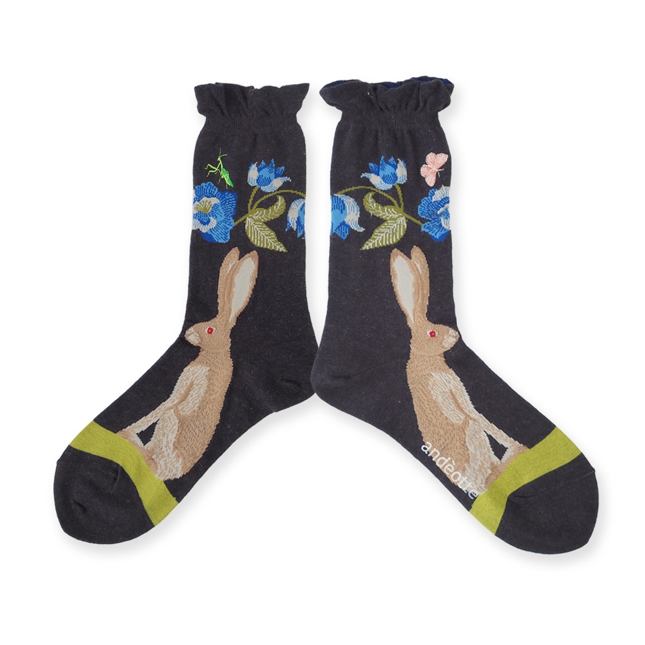ande アンデ ハイゲージ ソックス 刺繍 靴下 日本製 クルー丈 ラビット/チャコール041