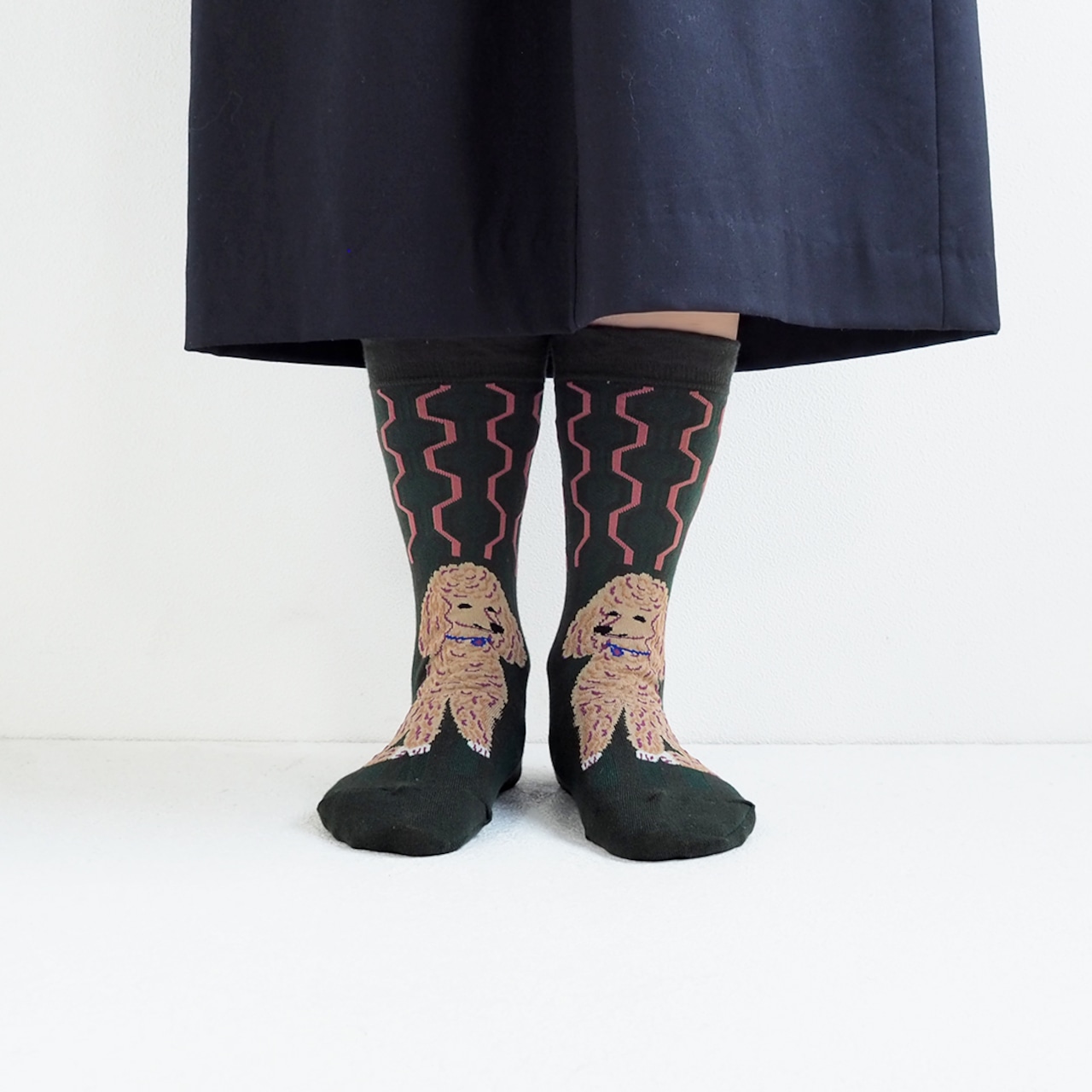 ande アンデ ハイゲージ ソックス 刺繍 靴下 日本製 クルー丈 ドッグ/グリーン081
