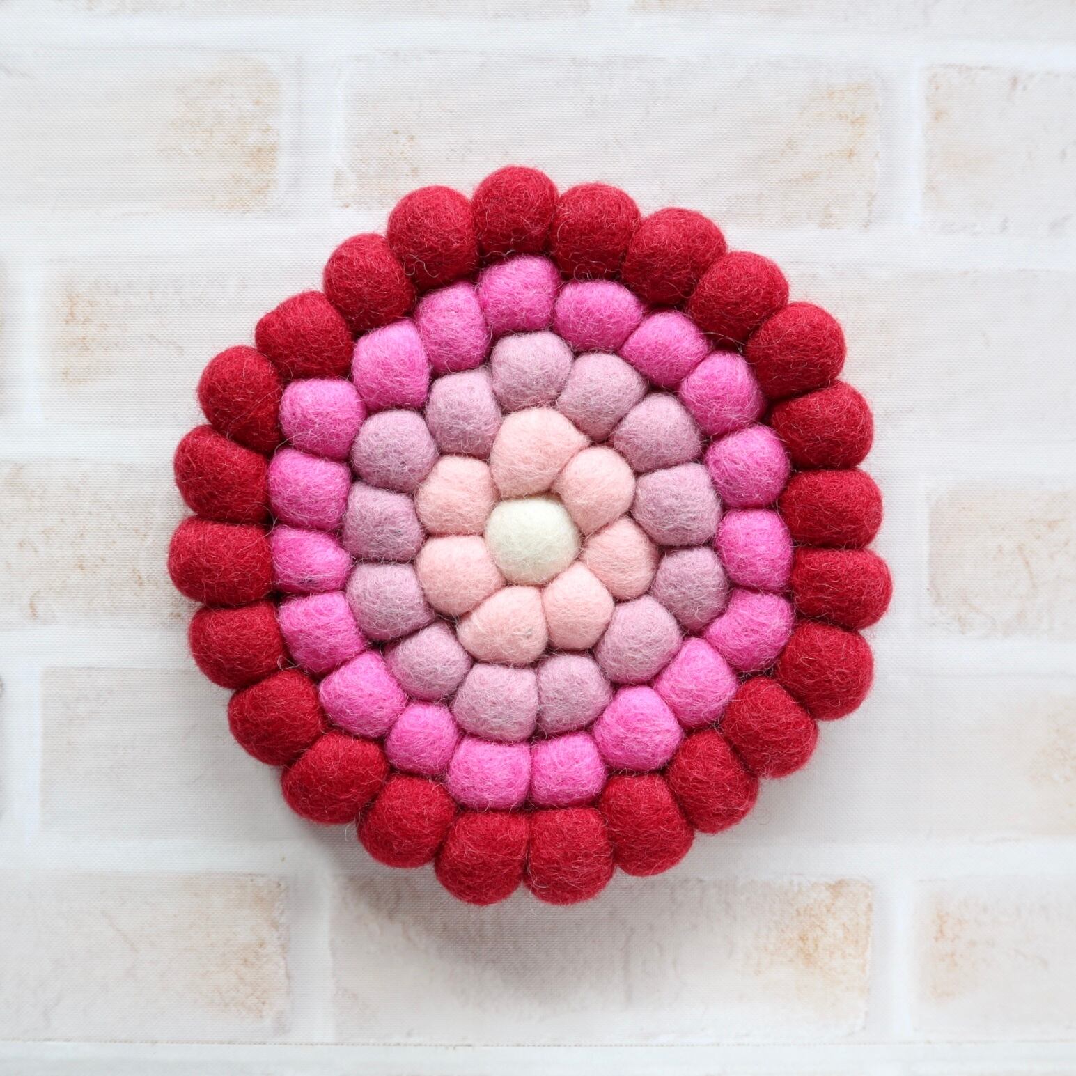 上質なウールを使用したフェルトボールをひとつひとつ丁寧に手作業でつなぎ合わせて作られた鍋敷きです。