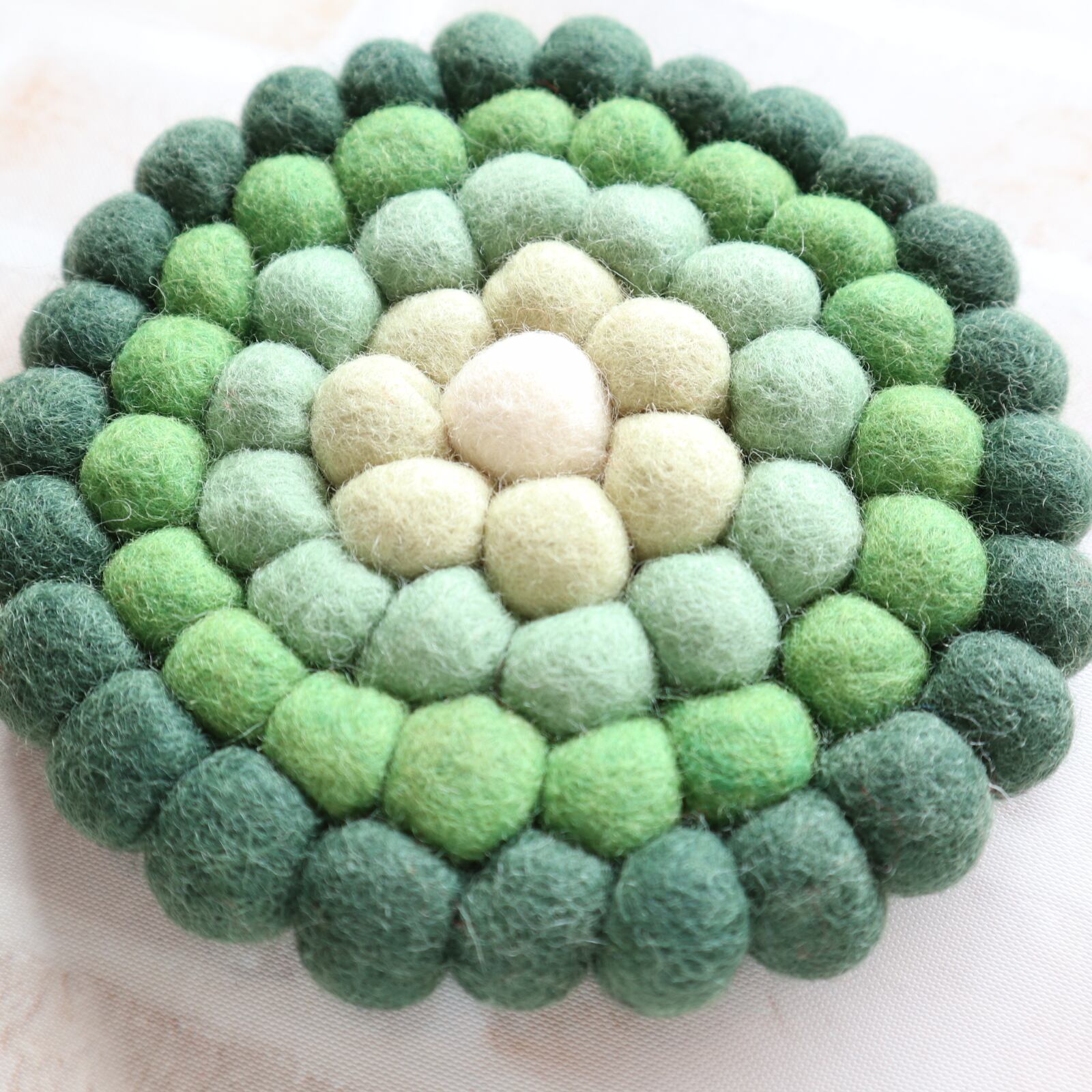 上質なウールを使用したフェルトボールをひとつひとつ丁寧に手作業でつなぎ合わせて作られた鍋敷きです。