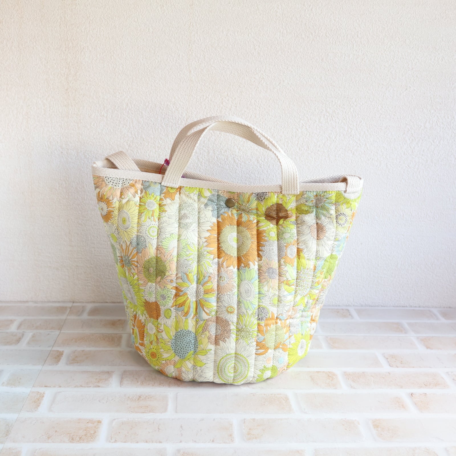 キルティング加工を施したリバティプリント生地を使用したバスケットトートです。
