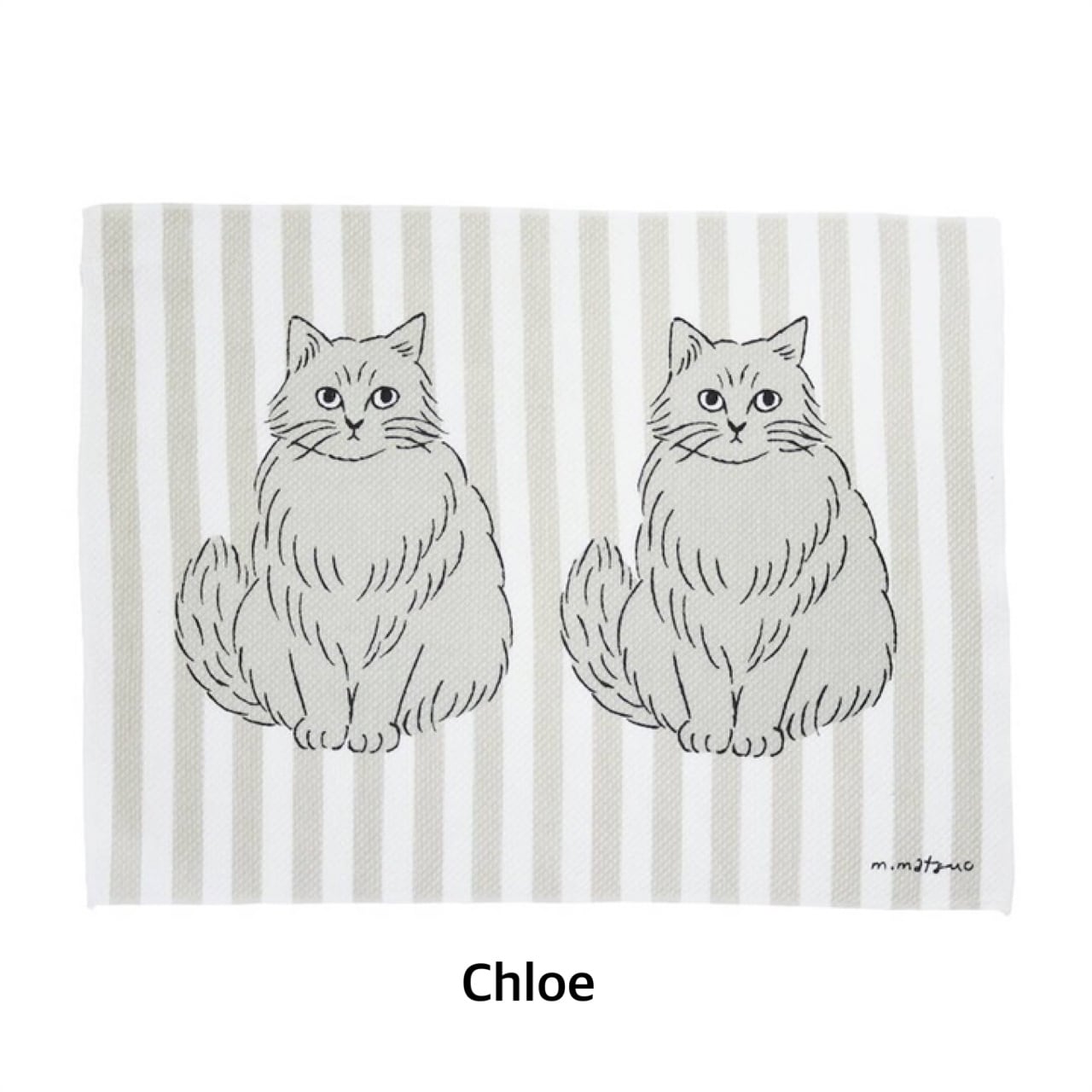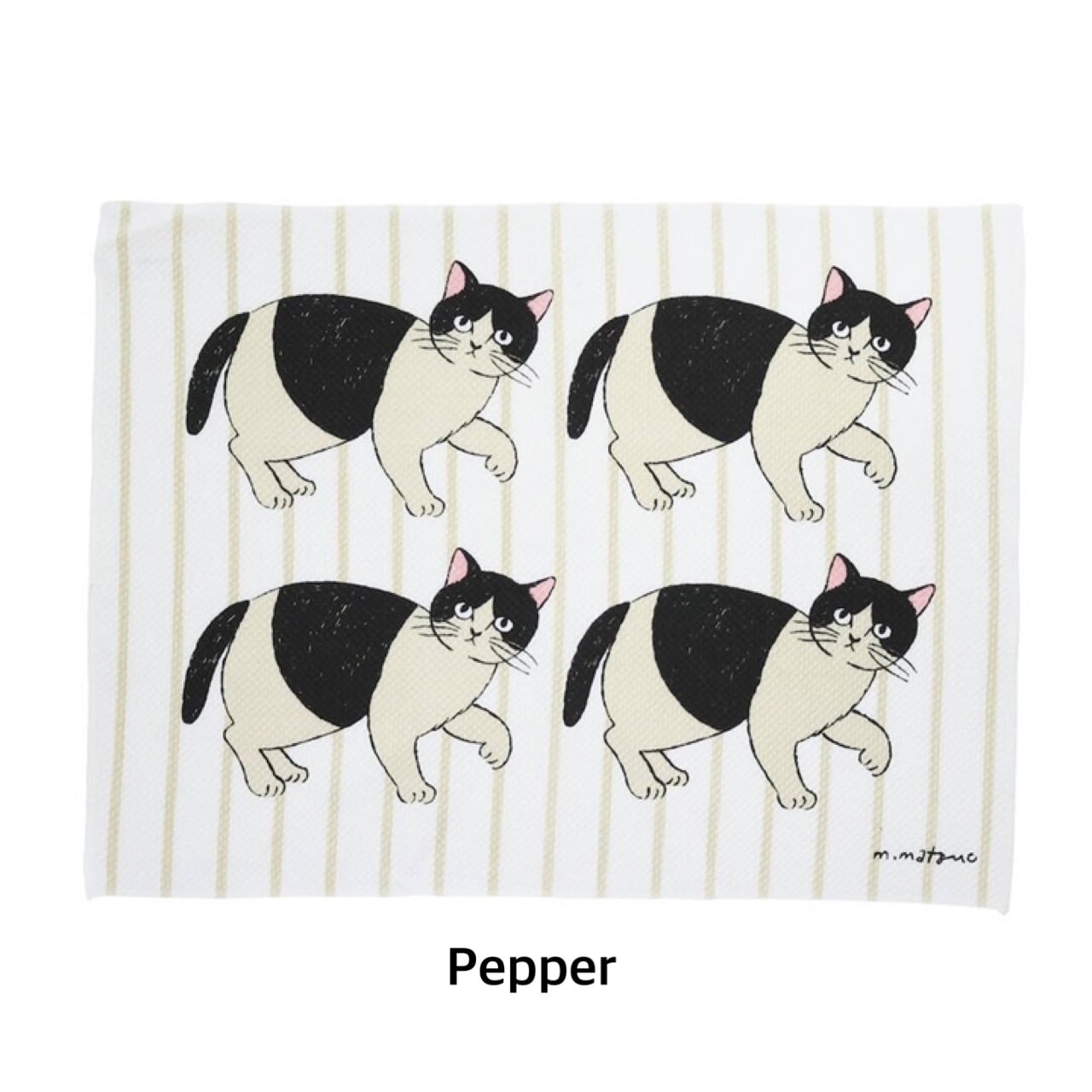 ストライプ柄を背景に、松尾ミユキさんのネコたちがちょこんと描かれたキッチンクロス。
