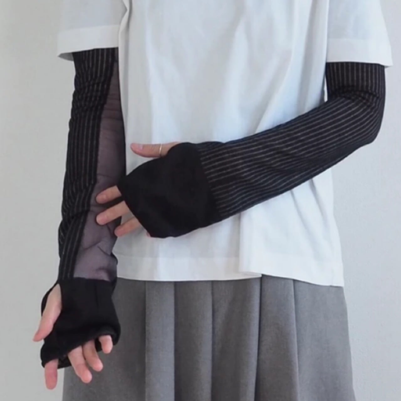 腕の内側部分がシアー(透け感のある仕様)になった、ロング丈のアームカバー。