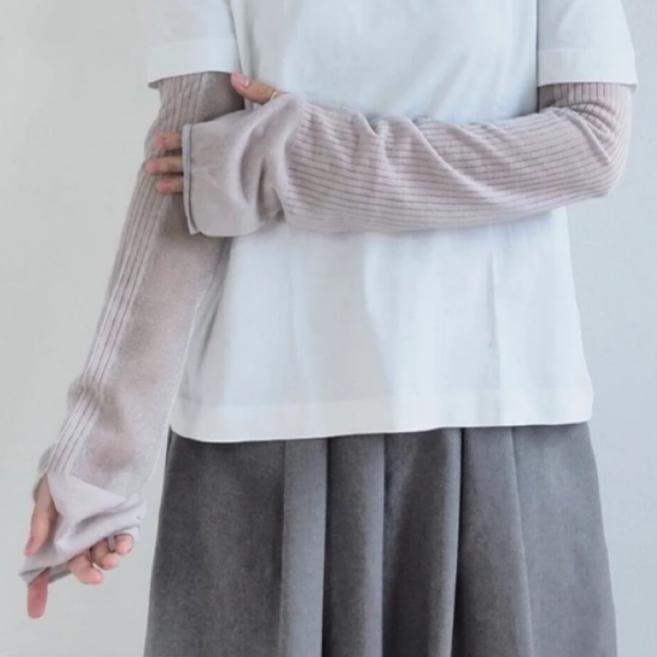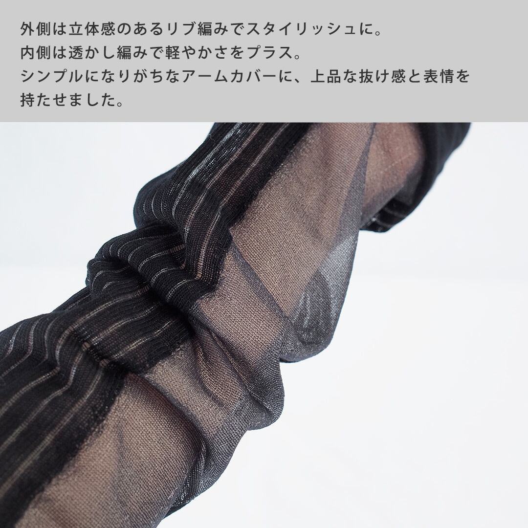 腕の内側部分がシアー(透け感のある仕様)になった、ロング丈のアームカバー。