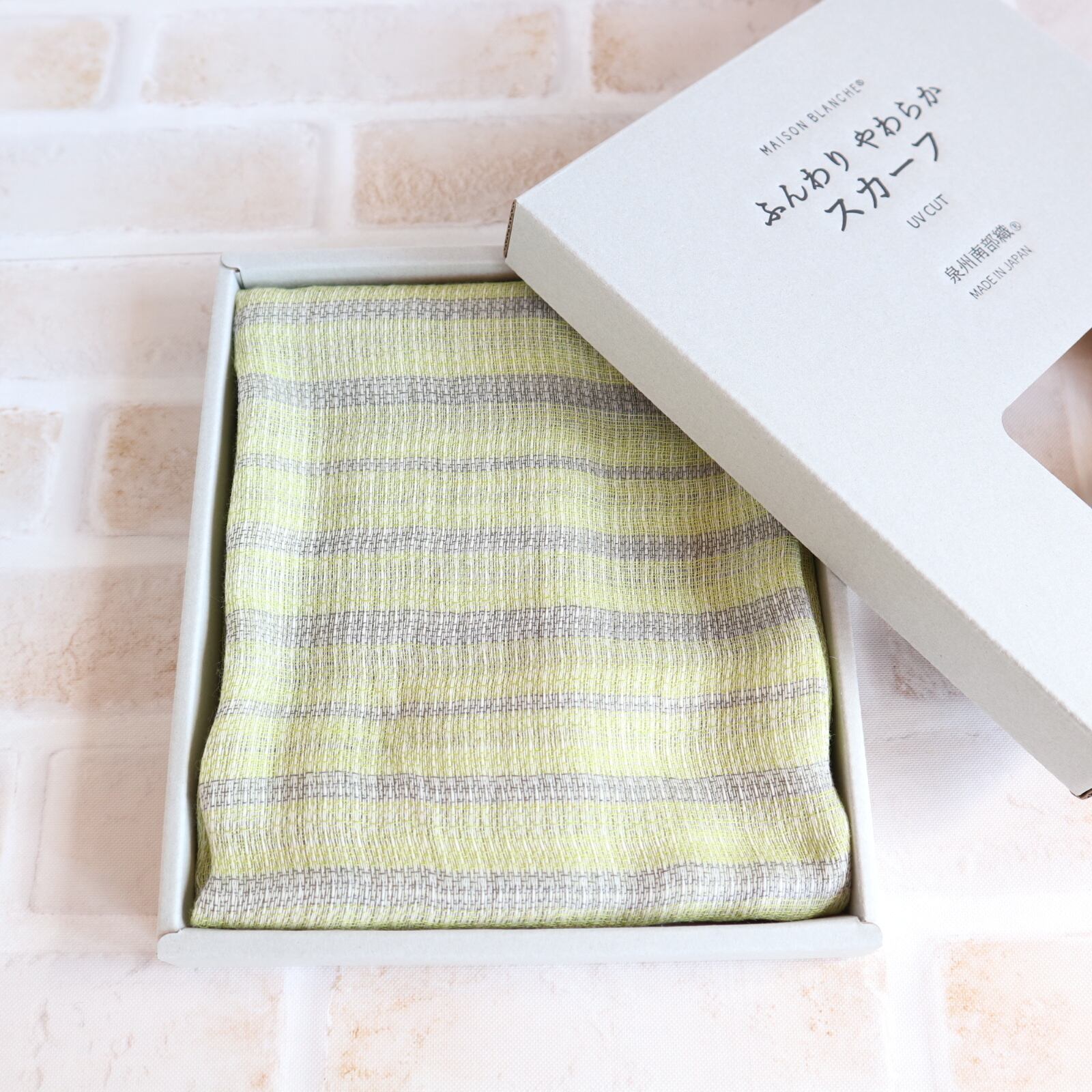 泉州の職人技が光るこのシリーズは、織り組織をランダムに仕立てることで、まるで空気を編み込んだような軽やかさを実現。タオルのようなやさしい肌ざわりで、首元をふんわり包み込みます。