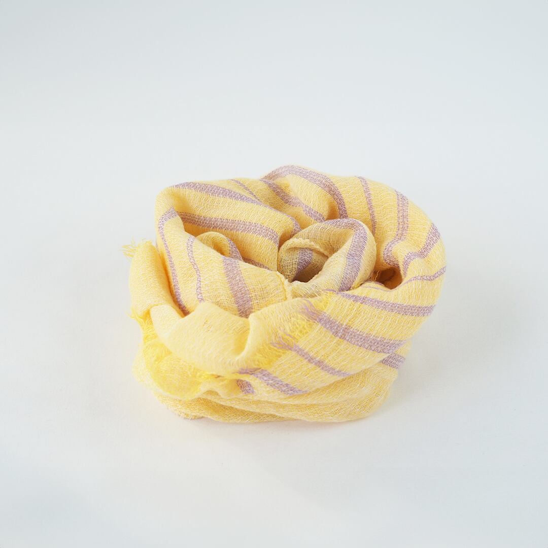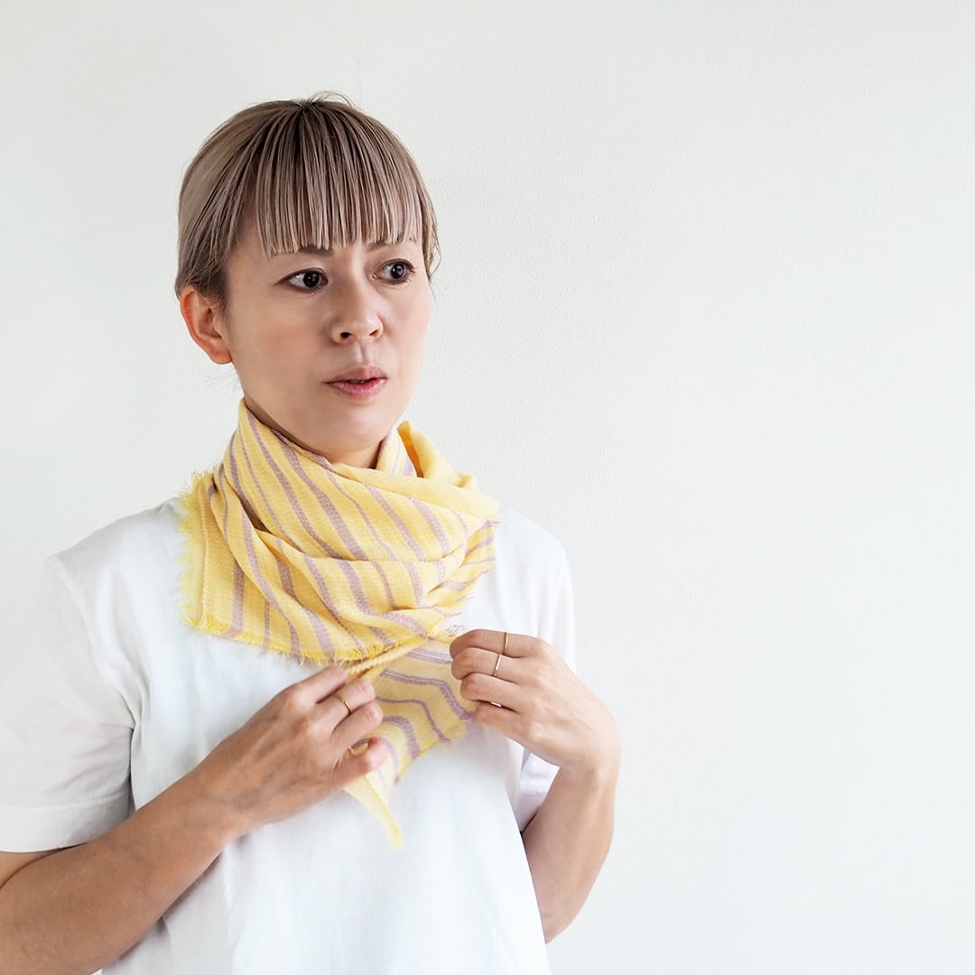 泉州の職人技が光るこのシリーズは、織り組織をランダムに仕立てることで、まるで空気を編み込んだような軽やかさを実現。タオルのようなやさしい肌ざわりで、首元をふんわり包み込みます。