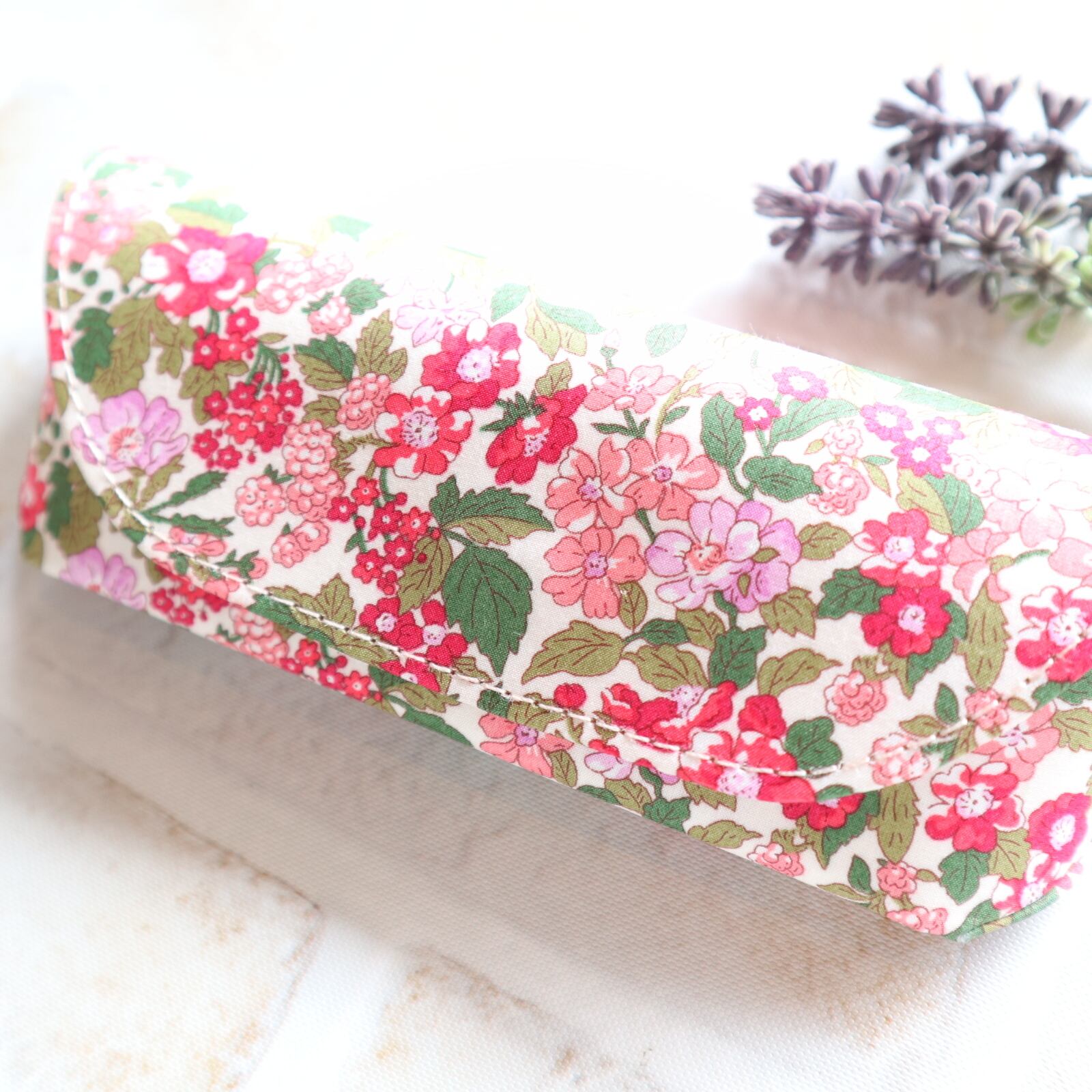 表面にはリバティプリントを、内側にはスエード調の合皮を使用していて、しっかりメガネを保護しつつも、ハードになり過ぎない女性らしい雰囲気が魅力です。